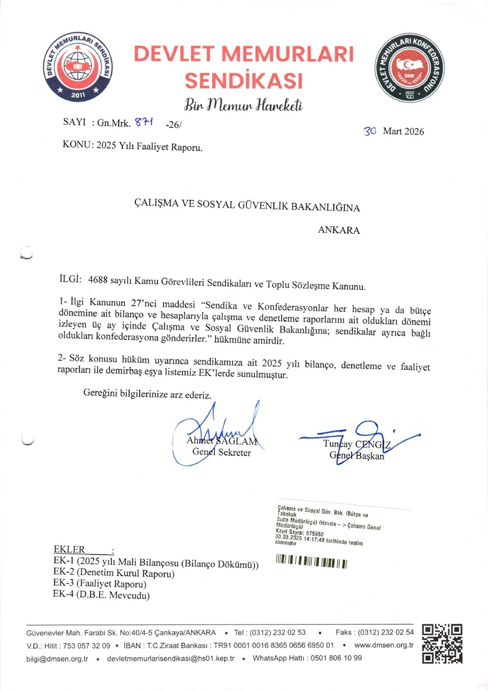 Bu çerçevede, 2025 yılına ait tüm denetim raporları, bilanço, mali ve faaliyet raporları 30 Mart 2026 tarih ve Gn.Mrk-871-26 sayılı ve “2025 Yılı Faaliyet Raporu” konulu yazımız ile Çalışma ve Sosyal Güvenlik Bakanlığı ile üst kuruluşumuz Devlet Memurları Konfederasyonuna göndermiştir.