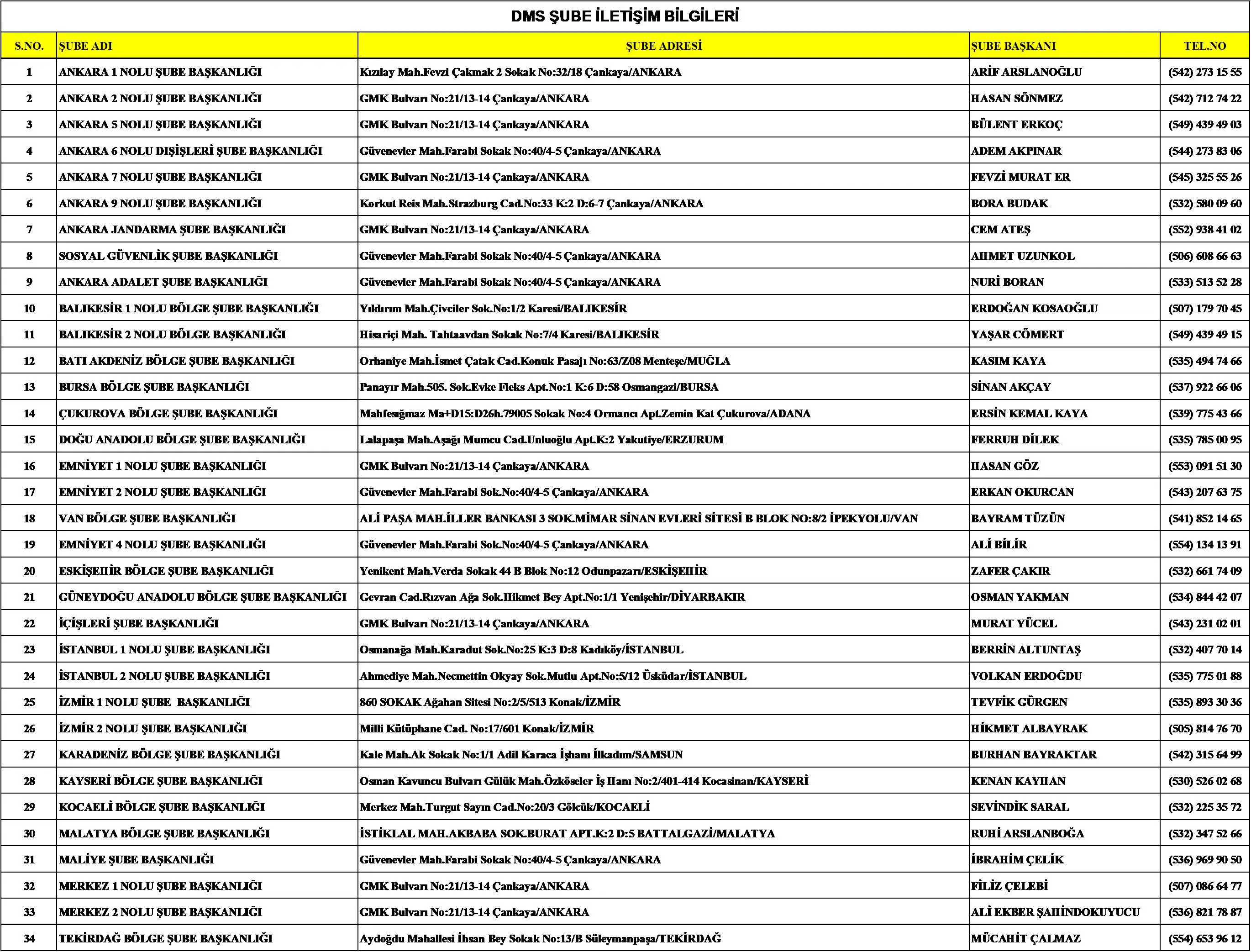 DMS ŞUBE İLETİŞİM BİLGİLERİ