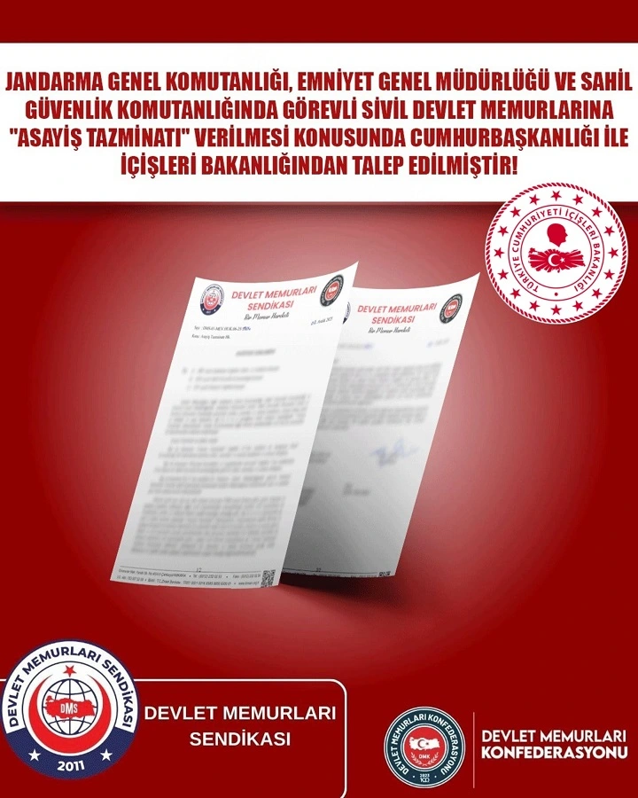 Daha önce; yetkili sendika olduğumuz Jandarma Genel Komutanlığı ve Sahil Güvenlik Komutanlığında görevli sivil Devlet memurlarına “Asayiş Tazminatı” ödenmesi amacıyla çalışmalar yapılmış, kanun değişiklik talepleri Jandarma Genel Komutanlığınca İçişleri Bakanlığına iletilmiş, ancak İçişleri Bakanlığı tarafından bütüncül çalışma yapılması gerekçesiyle sonuçlandırılmamıştır.