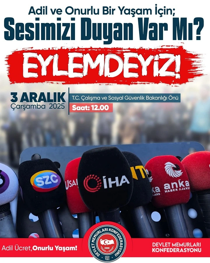 Devlet Memurları Konfederasyonu, Devlet Memurları Sendikası ve paydaş sendikaları olarak; 03 Aralık 2025 Çarşamba günü, saat 12:00’de, Çalışma ve Sosyal Güvenlik Bakanlığı önünde haklarımız için ses veriyoruz.