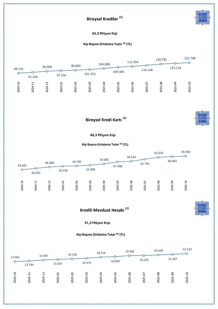 Türkiye Bankalar Birliği Risk Merkezinin RİSK MERKEZİ linkinde yer alan Ekim 2025 Ayı Risk Merkezi Aylık Bültenine bakıldığında, ortalama 40 Milyon kişinin bankalara borçlandığı, fert başına ortalama 125.748 TL bireysel kredi, 66.983 TL kredi kartı ve 22.423 TL kredili mevduat olmak üzere fert başına ortalama toplam borç 215.154 TL görülüyor.
