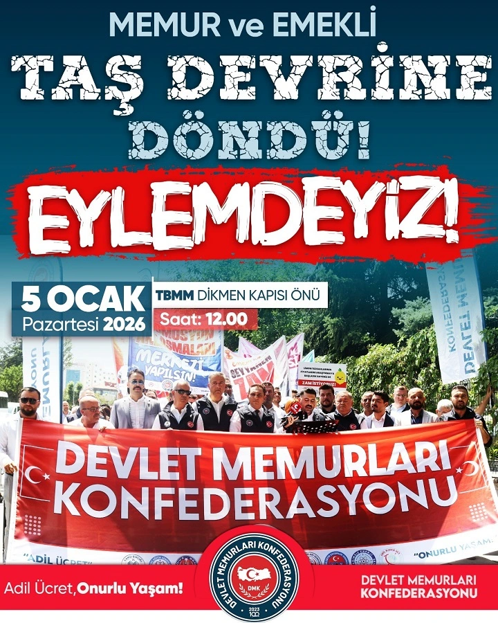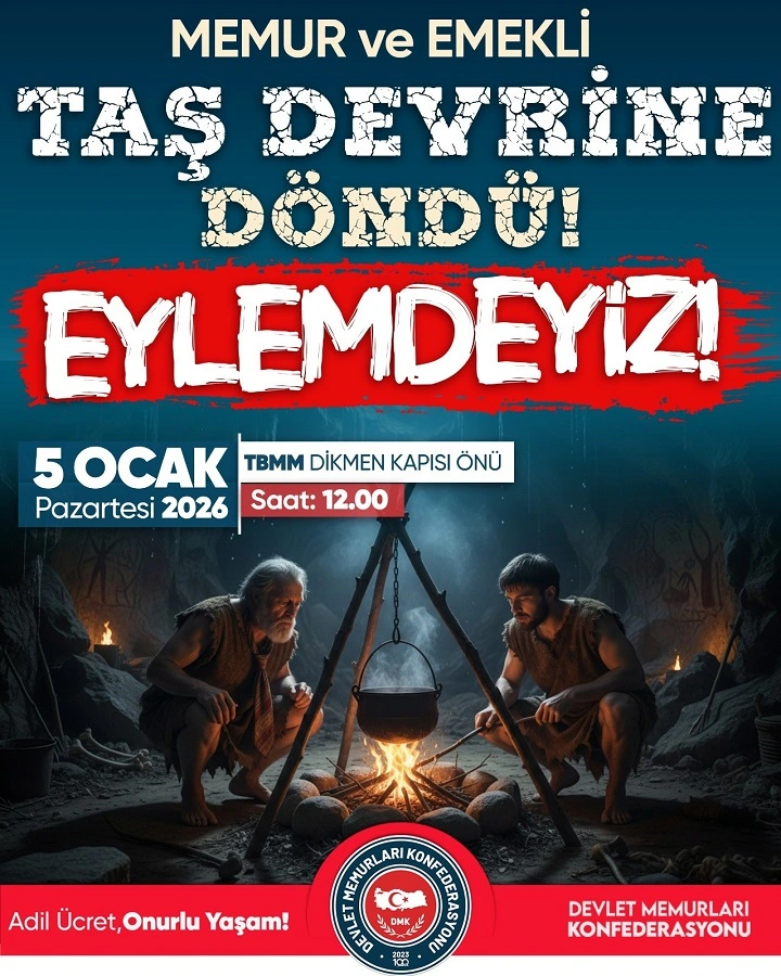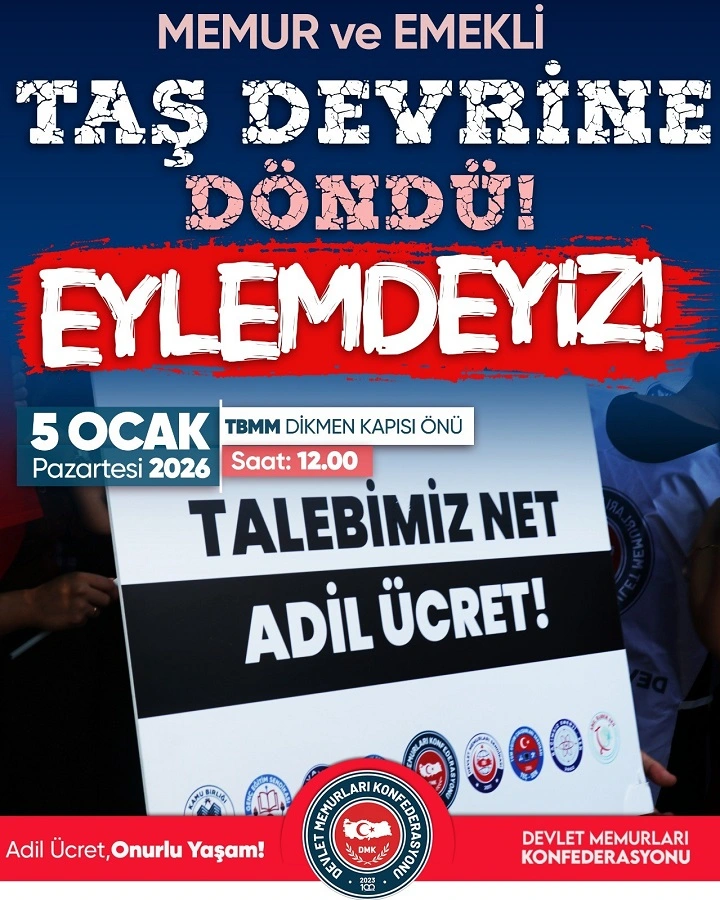 Devlet Memurları Konfederasyonu ve paydaş sendikaları olarak; “Adil bir ücret onurlu yaşam” için 05 Ocak 2026 tarihinde Saat 12:00’da TBMM Dikmen kapısı önünde basın açıklaması yapıyor, adeta taş devrini yaşayan memur ve emeklinin ızdırabını kamuoyu ile paylaşıyoruz.