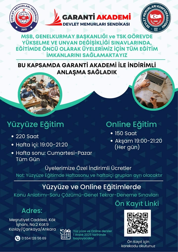 Devlet Memurları Sendikası olarak, MSB-TSK GYUD sınavına hazırlık amacıyla indirimli yüz yüze ve online eğitim hizmetimizin yanında yeni müfredata uygun güncel dijital kitap ve 1500 sorudan oluşan soru bankası dağıtımı yapılacak, kitap ve soru bankasına aynı zamanda www.dmsenegitim.net adresimizden de ulaşılabilecektir.